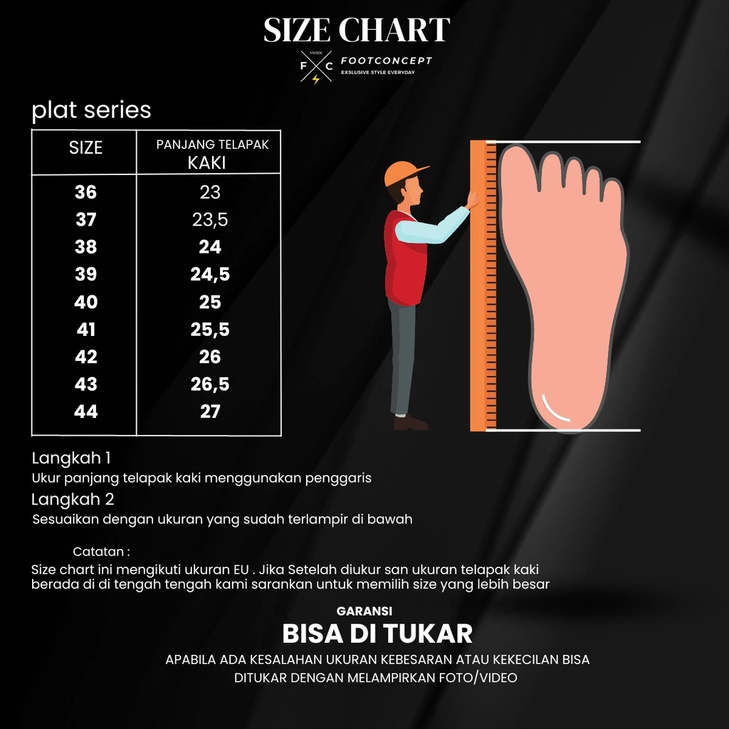 – Cocokan hasil pengukuran kaki tersebut dengan Size Cart Dibawah ini